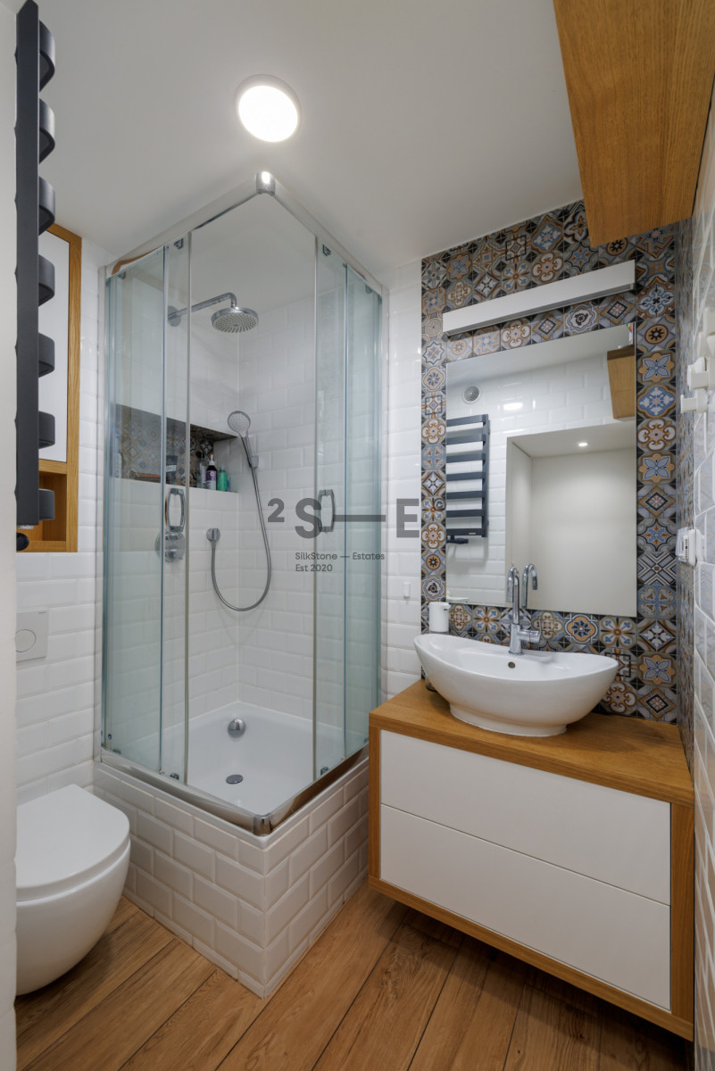 - Łazienka wyposażona w prysznic, toaletę oraz oddzielną pralnię/schowek (5 m2),