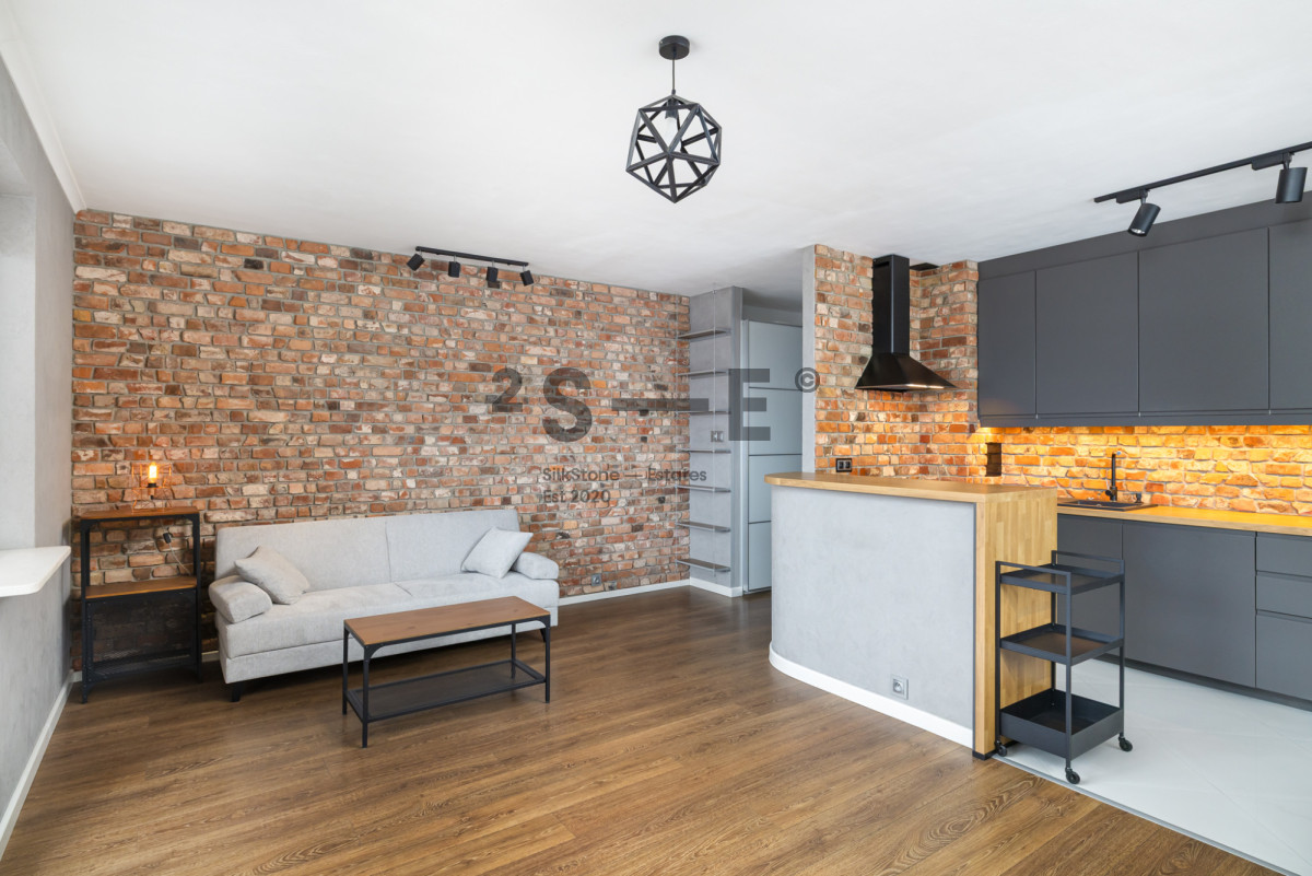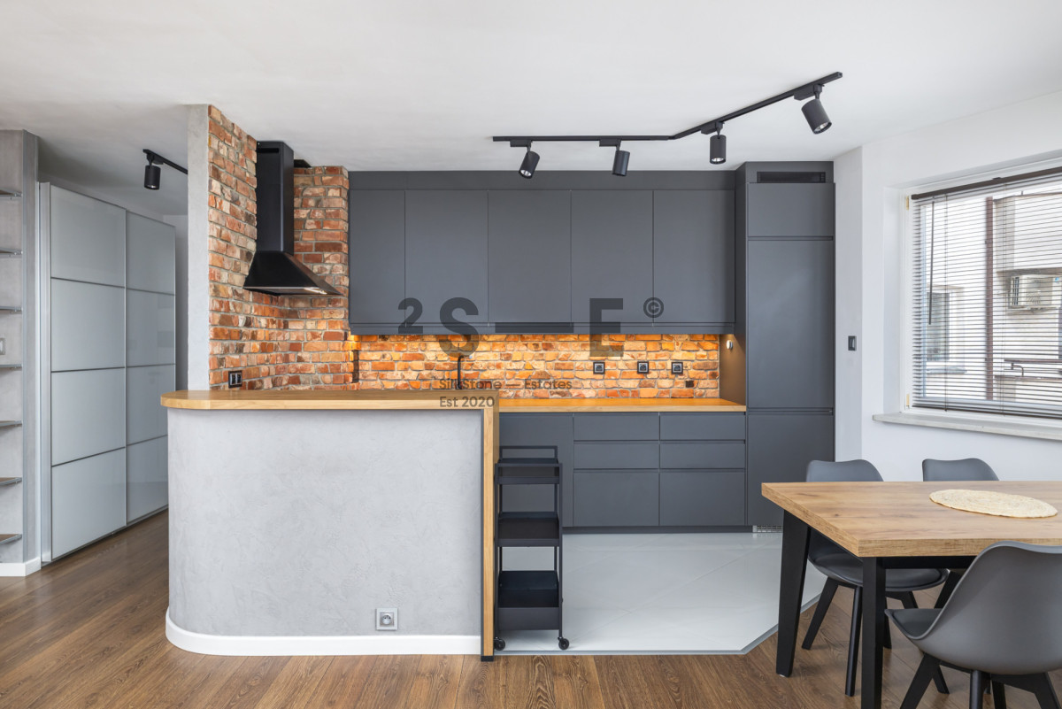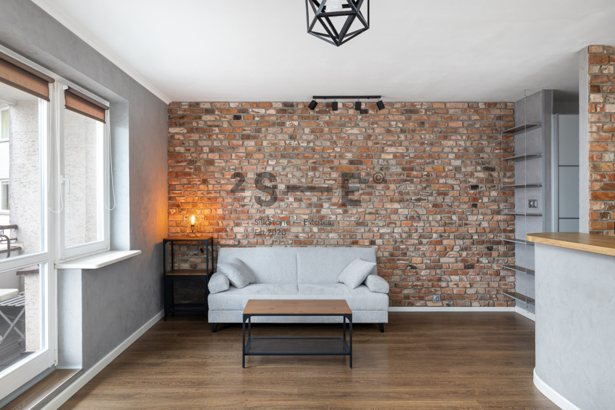 Wnętrze mieszkania łączy surowe elementy cegły, betonowe faktury i ciepłe drewno, tworząc spójną, elegancką i bardzo przytulną przestrzeń. Salon jest jasny i przestronny, z dużymi oknami zapewniającymi doskonałe doświetlenie. Charakteru wnętrzu nadaje ściana z naturalnej cegły, designerskie oświetlenie oraz nowoczesne meble w stonowanej kolorystyce. Część kuchenna zaprojektowana jest z myślą o miłośnikach gotowania. Jest tu dużo blatów oraz wygospodarowane miejsce na część jadalnianą. Mieszkanie jest w pełni wyposażone w meble oraz sprzęty AGD (pralka, lodówka, piekarnik, zmywarka). Nie brakuje tutaj również miejsca do przechowywania rzeczy - sypialnia oraz przedpokój wyposażone są w szafy wnękowe a dodatkowo mamy również oddzielną garderobę. Istotnym elementem tej nieruchomości jest również wygodny balkon, z którego mamy widok na przestrzeń oraz klimatyzacja, która pozwoli przetrwać komfortowo najcieplejsze letnie dni. Okna oddalone są od ruchliwych ulic co sprawia, że mieszkanie jest ciche.