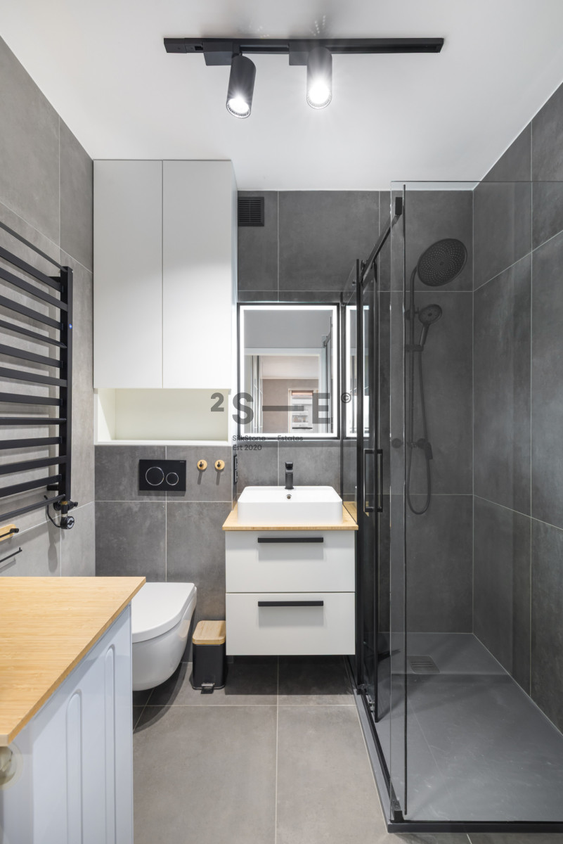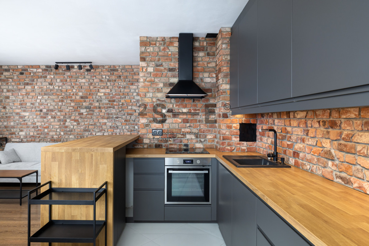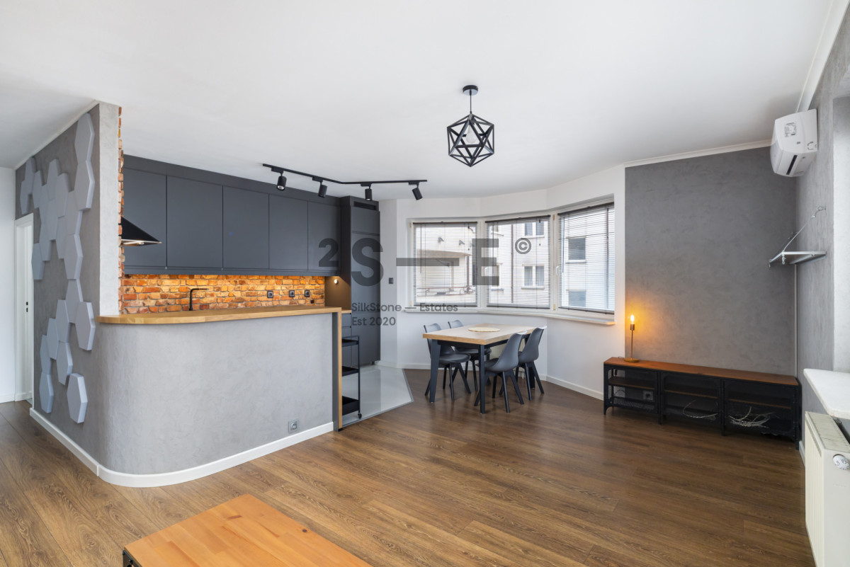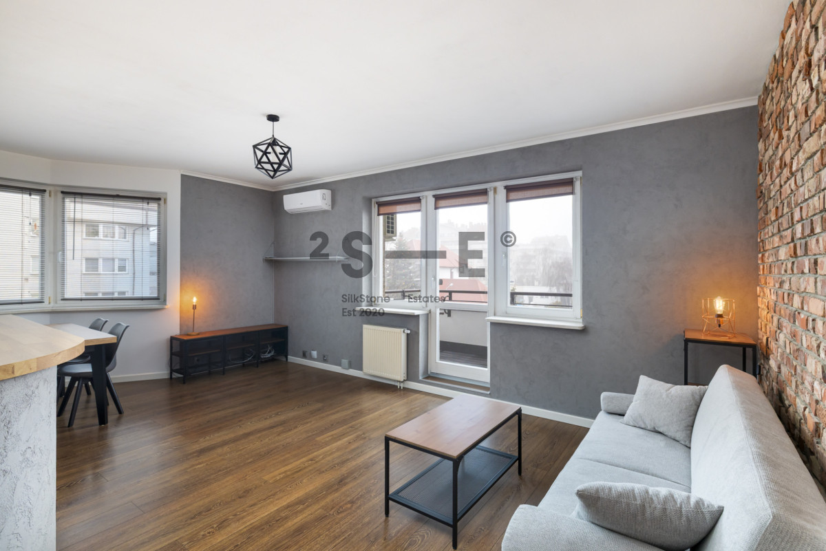 Wnętrze mieszkania łączy surowe elementy cegły, betonowe faktury i ciepłe drewno, tworząc spójną, elegancką i bardzo przytulną przestrzeń. Salon jest jasny i przestronny, z dużymi oknami zapewniającymi doskonałe doświetlenie. Charakteru wnętrzu nadaje ściana z naturalnej cegły, designerskie oświetlenie oraz nowoczesne meble w stonowanej kolorystyce. Część kuchenna zaprojektowana jest z myślą o miłośnikach gotowania. Jest tu dużo blatów oraz wygospodarowane miejsce na część jadalnianą. Mieszkanie jest w pełni wyposażone w meble oraz sprzęty AGD (pralka, lodówka, piekarnik, zmywarka). Nie brakuje tutaj również miejsca do przechowywania rzeczy - sypialnia oraz przedpokój wyposażone są w szafy wnękowe a dodatkowo mamy również oddzielną garderobę. Istotnym elementem tej nieruchomości jest również wygodny balkon, z którego mamy widok na przestrzeń oraz klimatyzacja, która pozwoli przetrwać komfortowo najcieplejsze letnie dni. Okna oddalone są od ruchliwych ulic co sprawia, że mieszkanie jest ciche.